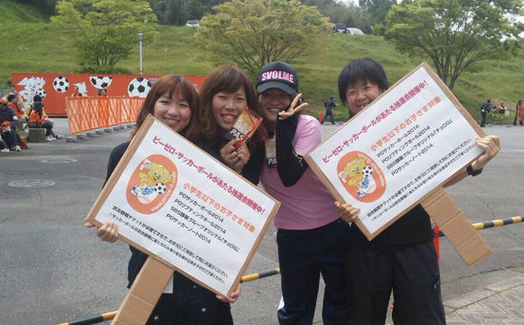 当日はJリーグディビジョン1の「清水vs鳥栖」戦が行われ、試合観戦に訪れた多くの子供たちに、協賛企業のロゴマークがプリントされたオリジナルのサッカーボール4号球と、リフティング練習用ボール、P0サッカーノート、協賛企業様提供のチョロQなどが無料(抽選)でプレゼントされました。